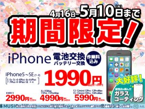 2022.4.19キャンペーン紹介 【期間限定】4/16~5/10まで!バッテリー交換がお得に出来ます!【スマホ修理工房 西八王子店】 こんにちは! スマホ修理工房 西八王子店です! 期間限定のお得なキャンペーンのご案内です! 4/16(土)~5/10(火)の期間限定で、iPhone全機種のバッテリー交換が大変お得にできちゃいます!! バッテリー交換をご検討中の方は是非この機会にスマホ修理工房 西八王子店にご相談ください!